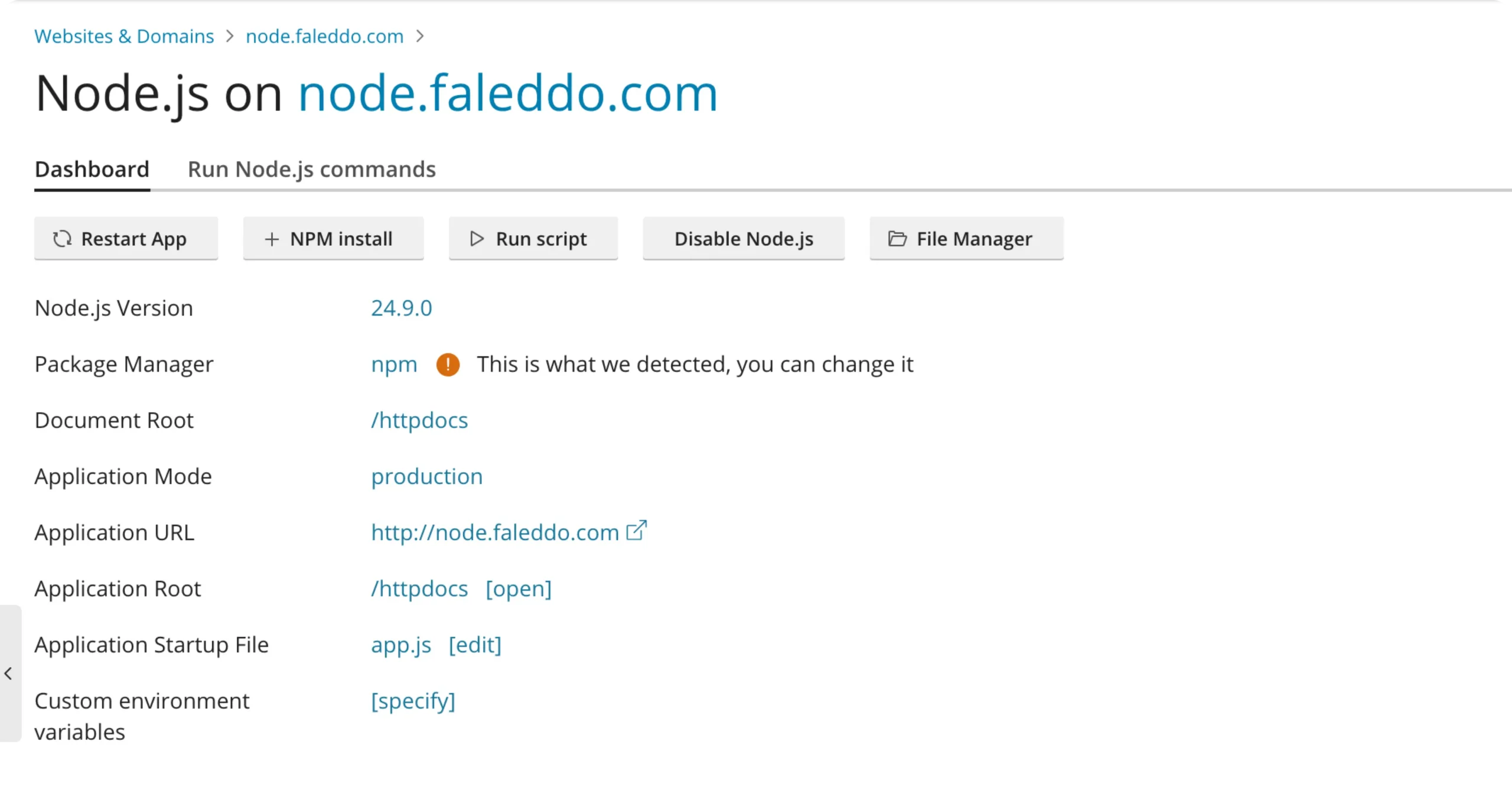 Pick your Node.js version, run npm scripts, and set environment variables from the panel. Restart apps instantly, no SSH gymnastics required.